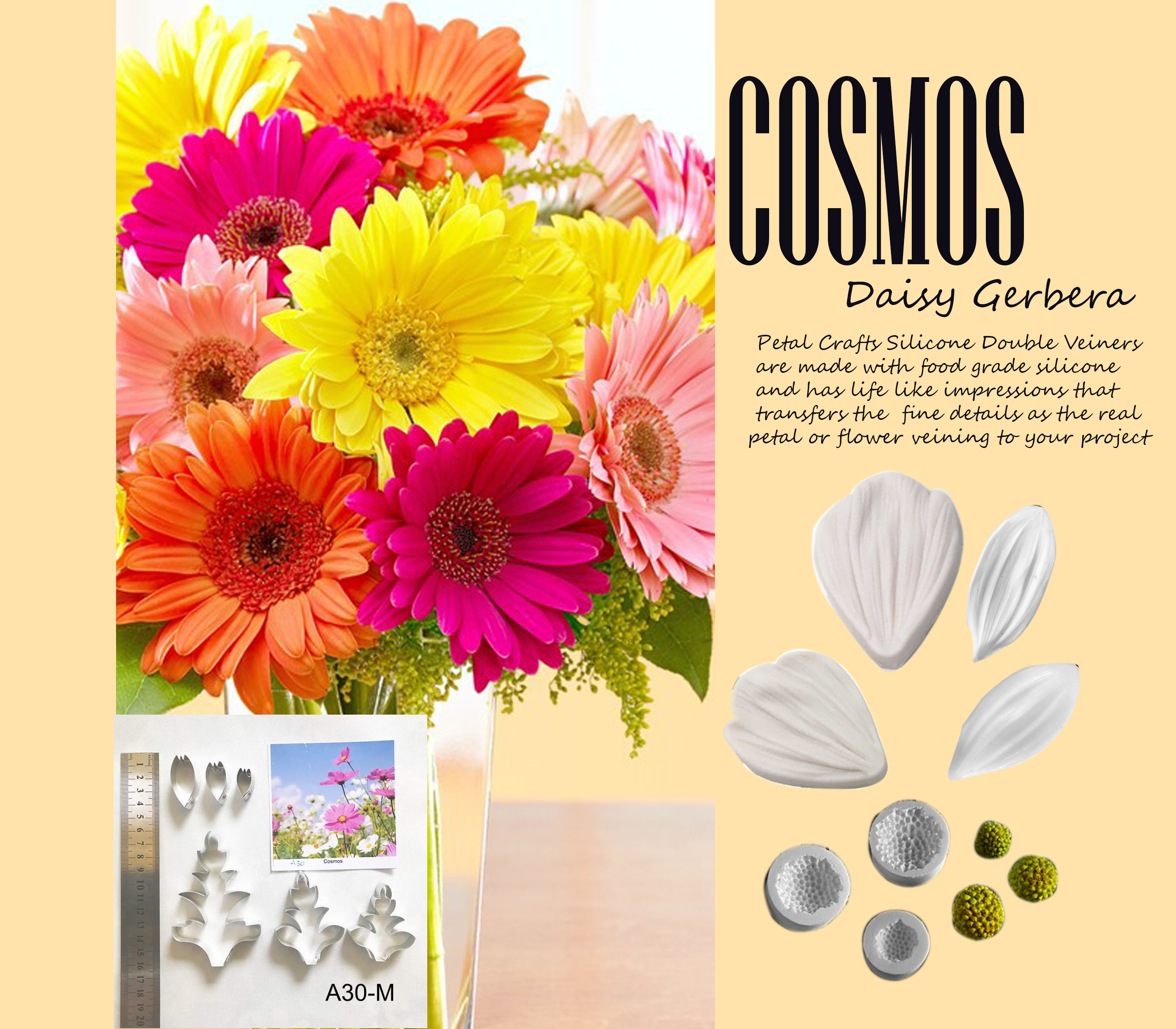 Cosmos Gerbera Daisy - Double Veiner Real Petal Leaf Flower Silicone Mould Mold Cutter Artificial Botanical for Gumspate Clay Flower Fondant Mastic